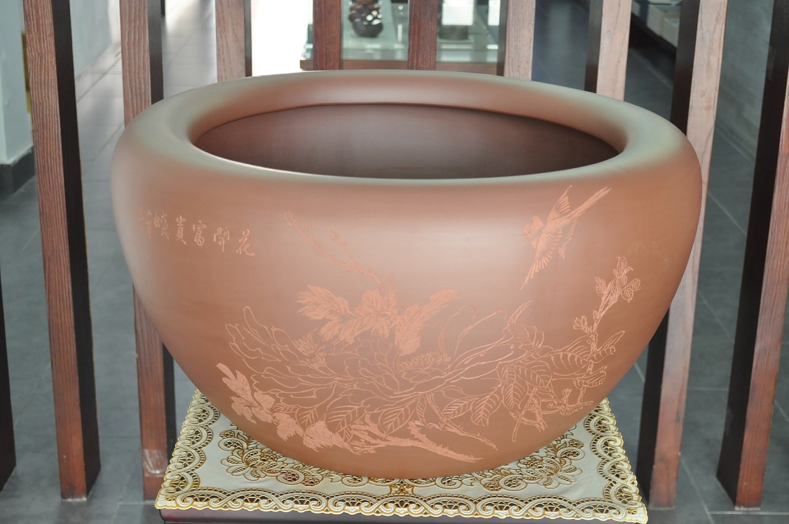 欣赏:采用“黄龙源”品牌的泥料“紫泥”制作的鱼缸,最大外围直径约65cm,高约36cm,也可用作画缸。