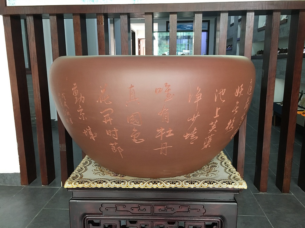 欣赏:采用“黄龙源”品牌的泥料“紫泥”制作的鱼缸,最大外围直径约65cm,高约36cm,也可用作画缸。